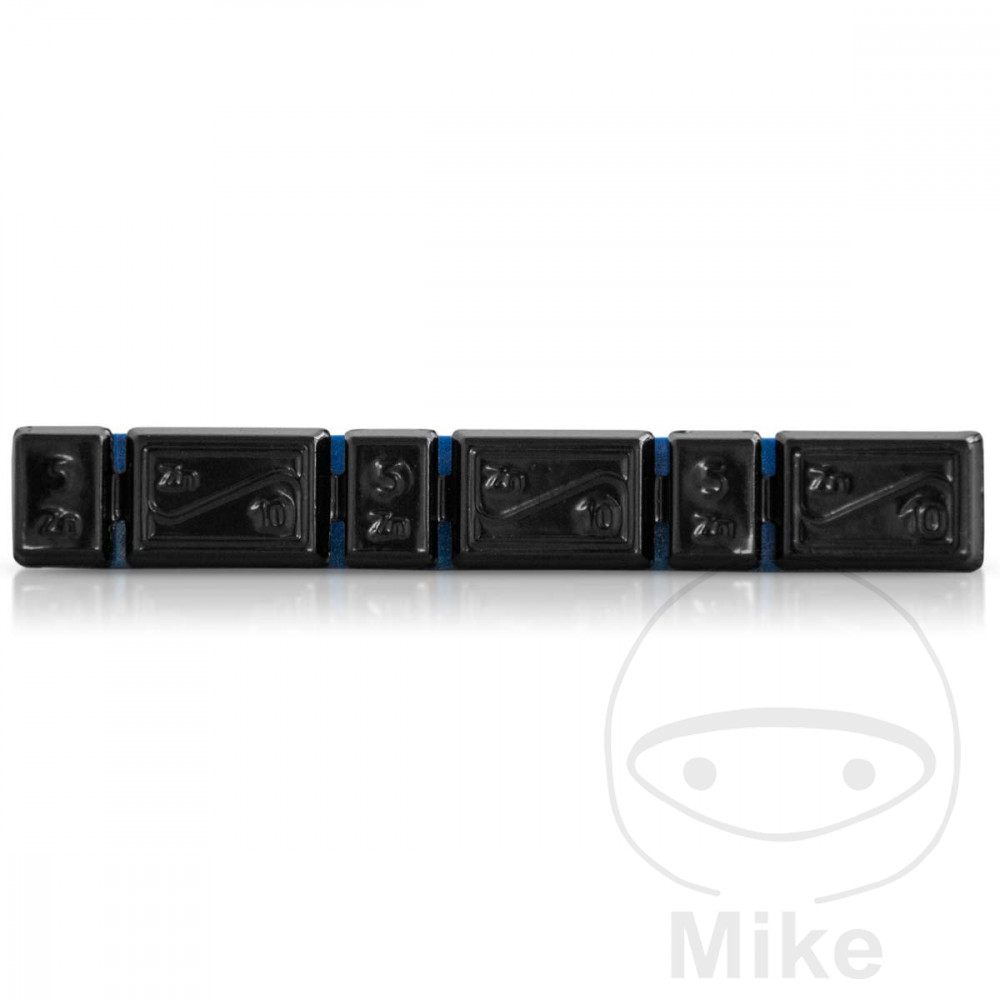 45 gram klæbestrimmel, opdelt i 3 x 5 x 3-gram og 10 gram segmenter Dybe fordybninger giver mulighed for nem adskillelse og let justering af vægten til kanten radius.